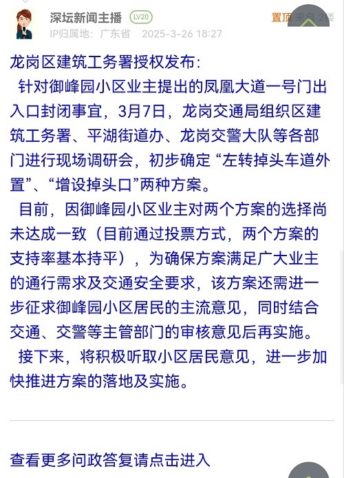 针对御峰园小区业主提出的凤凰大道一号门出入口封闭事宜,3月7日,龙岗交通局组织区建筑工务署、平湖街道办、龙岗交警大队等各部门进行现场调研会,初步确定 “左转掉头车道外置”、“增设掉头口”两种方案。目前,因御峰园小区业主对两个方案的选择尚未达成一致(目前通过投票方式,两个方案的支持率基本持平),为确保方案满足广大业主的通行需求及交通安全要求,该方案还需进一步征求御峰园小区居民的主流意见,同时结合交通、交警等主管部门的审核意见后再实施。接下来,将积极听取小区居民意见,进一步加快推进方案的落地及实施。