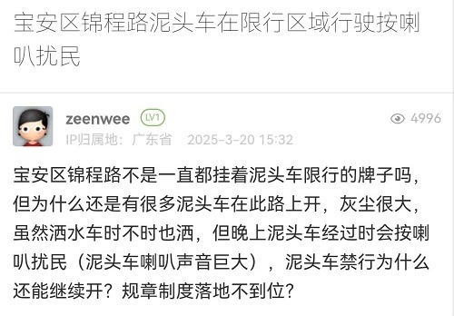 22. 帖文《宝安区锦程路泥头车在限行区域行驶按喇叭扰民》