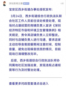 3月24日,西乡街道综合行政执法队联合社区工作人员前往该处核查处理,现场对占道经营的商铺负责人宣讲《深圳经济特区市容和环境卫生管理条例》相关规定,责令其店铺负责人立即整改。同时与店铺负责人进行沟通,要求店家主动劝导食客就餐期间注意时间、控制音量,避免出现噪音扰民的情况,目前现场已清理整改完毕。后续,西乡街道综合行政执法队将协同属地社区加强巡查,发现违规占道经营等行为及时整治处理。