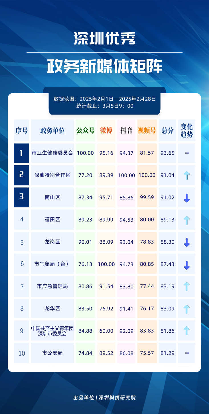 2月,市卫生健康委、深汕特别合作区、南山区、福田区、龙岗区、市气象局、市应急管理局、龙华区、中国共产主义青年团深圳市委员会、市公安局荣登“深圳优秀政务新媒体矩阵”榜单。2月,市卫生健康委账号运营成绩亮眼,微信公众号平台阅读量破10万次的文章超60篇;深汕特别合作区新媒体矩阵紧抓网络热点,作品吸引力显著;南山区新媒体矩阵则持续发力宣传,其微博号、头条号在对应平台榜单中居于前二位置。以上账号在“深圳优秀政务新媒体矩阵”榜单中荣获前三名。此外,福田区新媒体矩阵深耕短视频领域与今日头条平台,位于“深圳优秀政务新媒体矩阵”第四名,彰显出优秀的内容产出能力;龙岗区新媒体矩阵的抖音号分数超93分,反映其在视频制作方面的良苦用心,不断提升内容传播价值;市气象局新媒体矩阵则在微博、抖音平台持续创新气象领域内容,打造“趣味科普+民生服务”双驱模式。