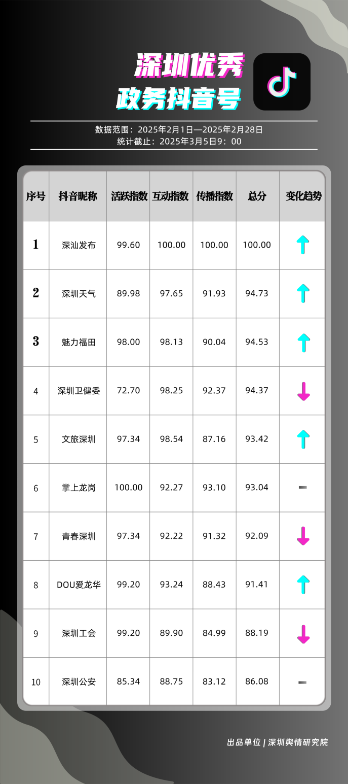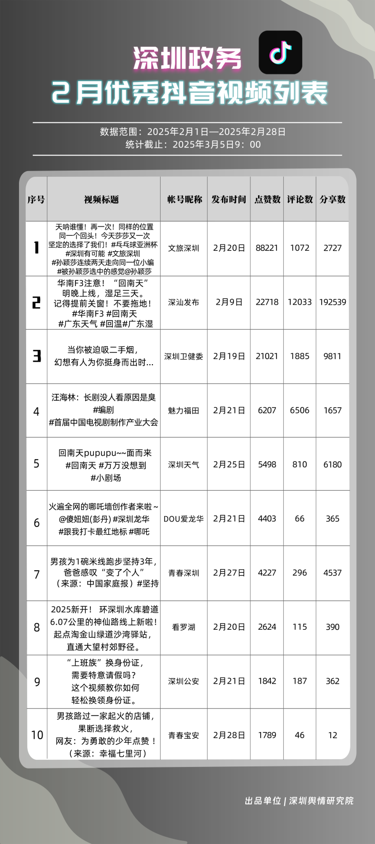 2月,“深汕发布”“深圳天气”“魅力福田”“深圳卫健委”“文旅深圳”“掌上龙岗”“青春深圳”“DOU爱龙华”“深圳工会”“深圳公安”共10个政务抖音号获得“深圳优秀政务抖音号”称号。“深汕发布”位于榜单第一名,值得关注的是,该账号2月作品总分享数超20万次,其中有关“华南地区回南天”的视频单条分享量达到19万次以上,展现出强劲的传播力。“深圳天气”“魅力福田”“深圳卫健委”三账号坚持输出优质内容,得分均在94分以上,展现出深圳政务新媒体账号在短视频传播领域的创新活力。