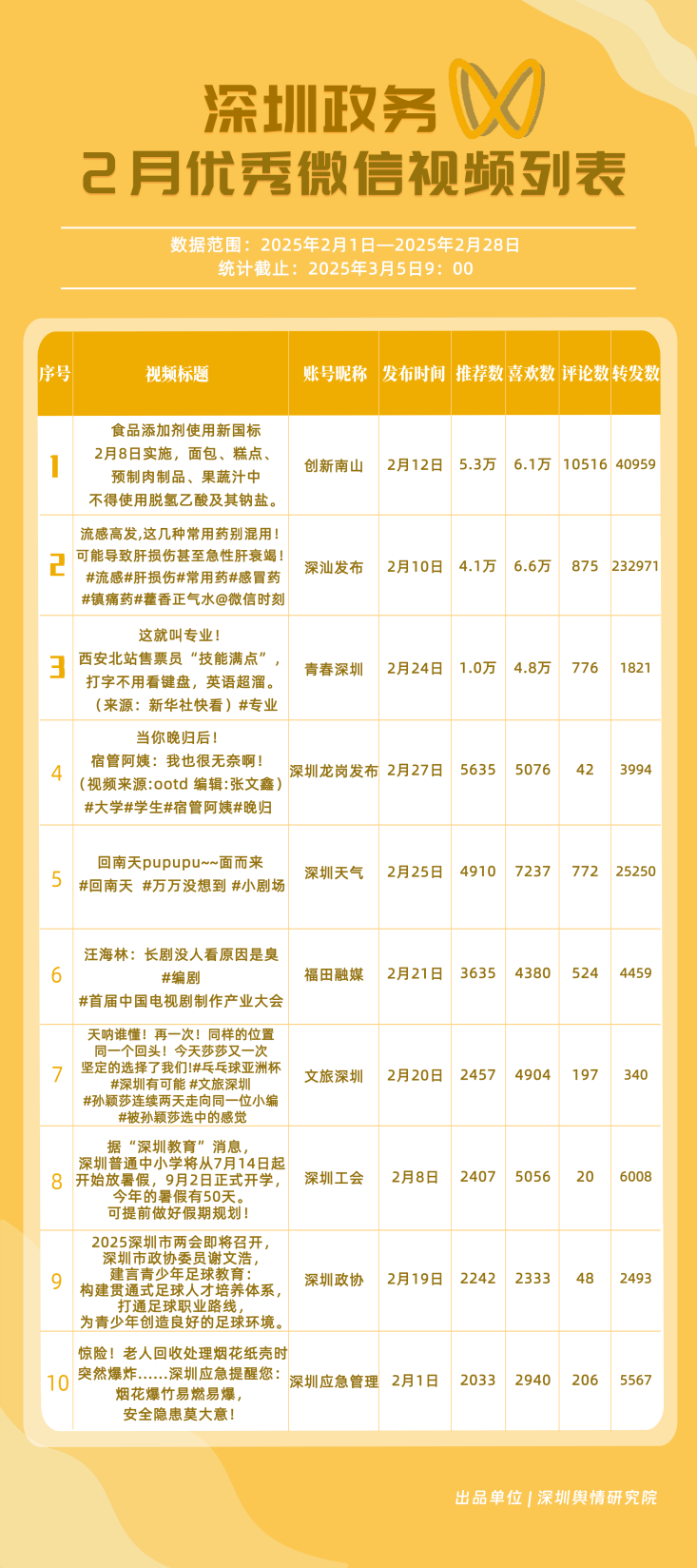 2月,获“深圳优秀政务微信视频号”称号的分别是“深汕发布”“创新南山”“青春深圳”“深圳卫健委”“深圳天气”“福田融媒”“滨海宝安”“深圳龙岗发布”“同心鹏城”“深圳应急管理”。其中,“深汕发布”“创新南山”占据榜单前2名,具体数据来看,两账号作品2月总转发量分别在60万、50万左右,总点赞量均超过10万,两账号在内容策划、形式创新、互动引导等方面表现突出。“青春深圳”“深圳卫健委”“深圳天气”“福田融媒”也处于榜单靠前位置,互动、传播等数据良好,总分超80分,在民生服务、区域宣传、信息科普等领域形成特色传播优势,在内容生产与传播创新方面具有一定引领作用。