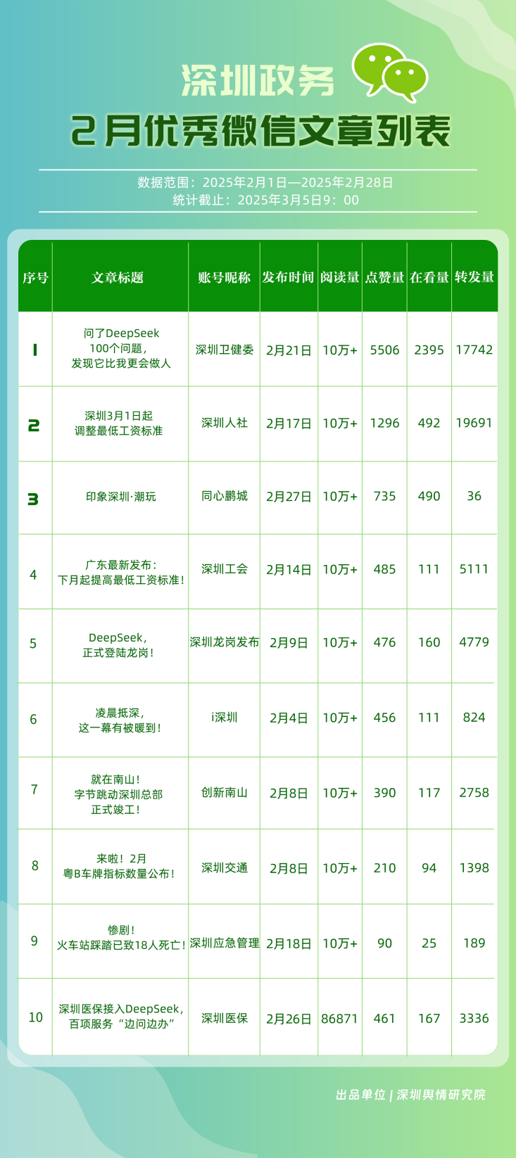 2月,“深圳卫健委”“深圳龙岗发布”“幸福福田”“i深圳”“创新南山”“青春深圳”“深圳工会”“深圳人社”“滨海宝安”“深圳光明”等30个账号入选“深圳优秀政务微信公众号”。其中,“深圳卫健委”2月作品总阅读数超600万次,转发超70万次,稳居榜单首位;“深圳龙岗发布”也在互动、传播方面取得较好成绩,位于榜单第二位;“幸福福田”活跃度有所提升,位于榜单第三名;紧随其后的是“i深圳”“创新南山”,总分均在87分以上,展现出各自在新媒体生态中的强大传播力与影响力。