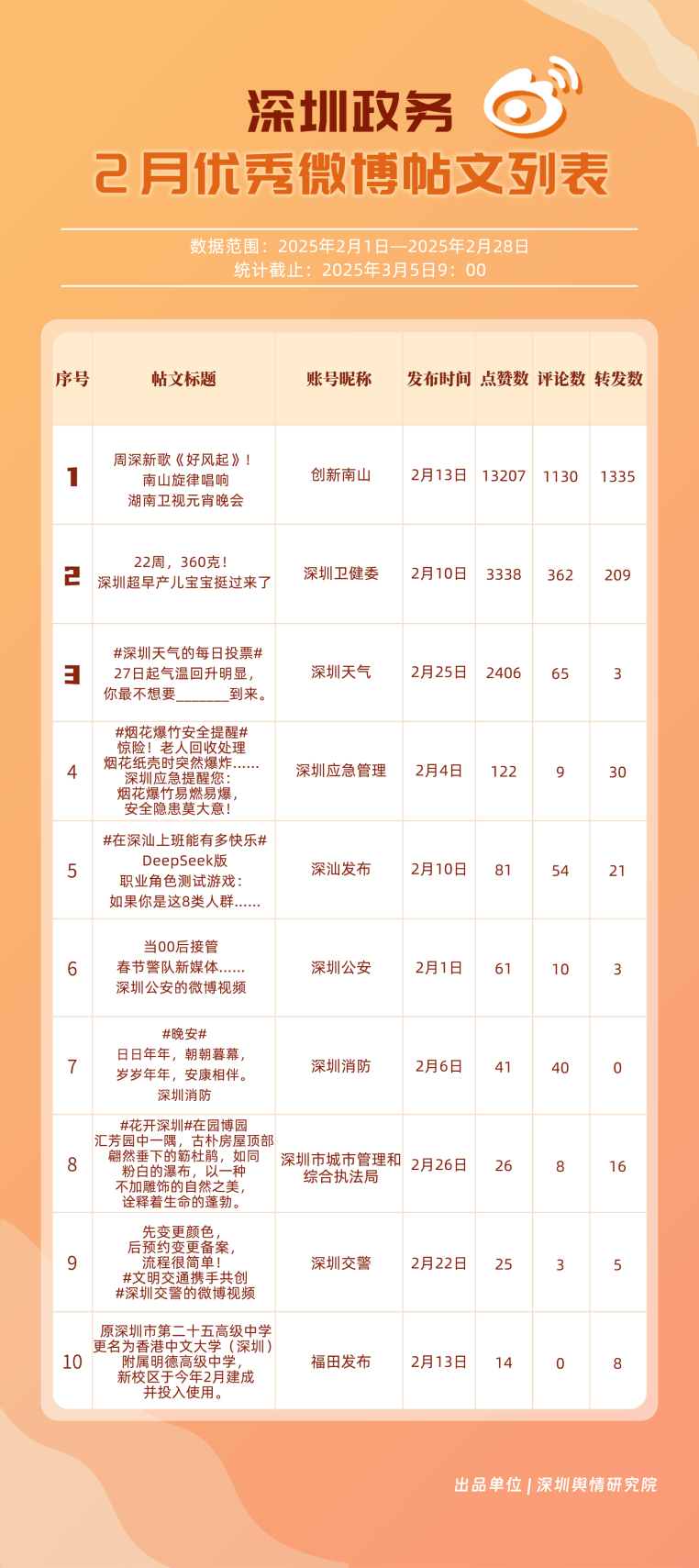 2月,“深圳天气”“创新南山”“深圳卫健委”“深圳消防”“深圳应急管理”“福田发布”“深圳公安”“深汕发布”“深圳龙岗发布”“深圳交警”等20个账号入选“优秀政务微博号”。综合看来,本月榜单前10名较上期变动不大,反映出靠前账号运营发挥较稳定。其中,“深圳天气”在榜单中获得第一名,该账号与网民互动积极,2月作品总点赞数超8万次;“创新南山”“深圳卫健委”“深圳消防”“深圳应急管理”也各有所长,排名靠前,展现出深圳政务微博在形象塑造、民生服务、应急科普等领域的持续影响力。