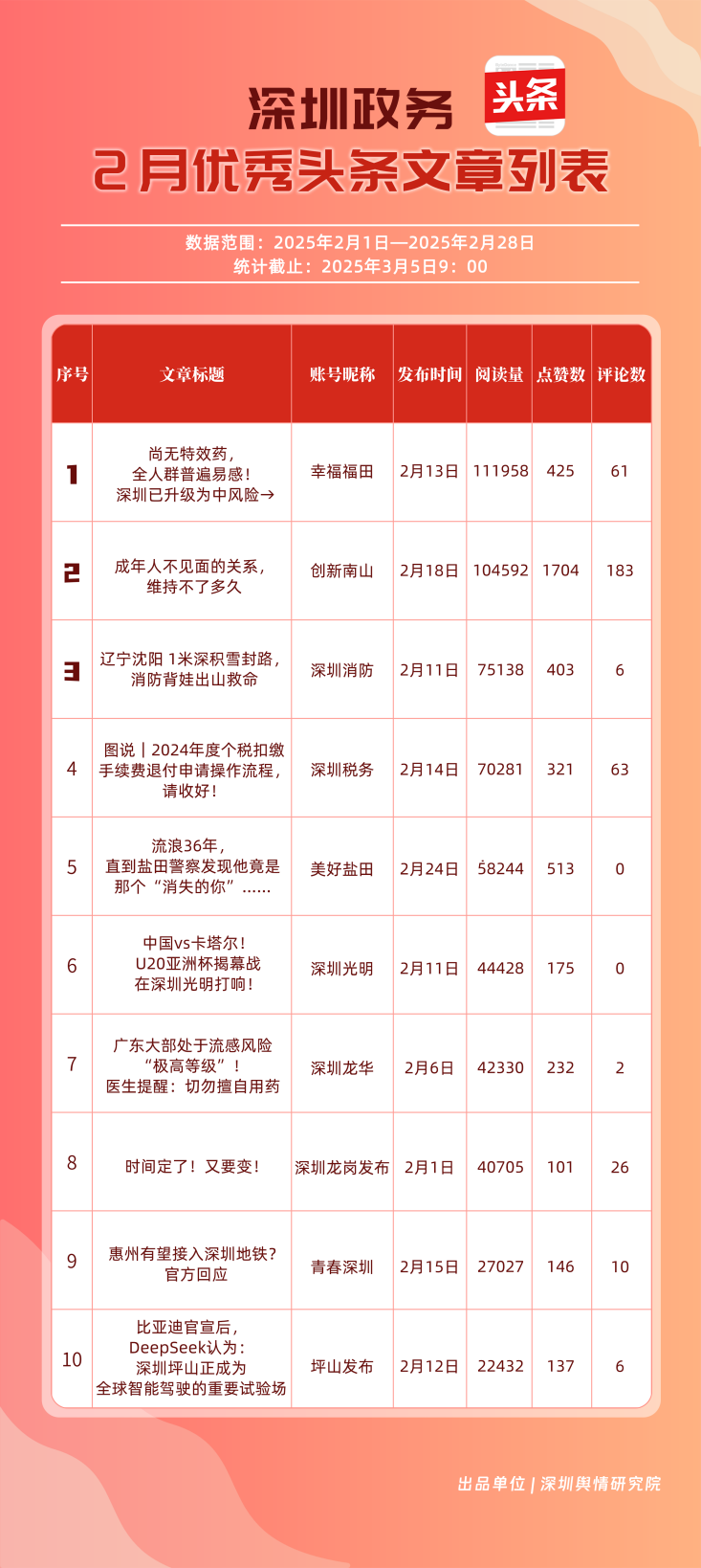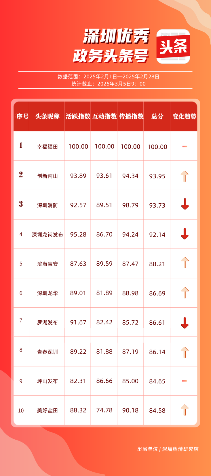 2月,“幸福福田”“创新南山”“深圳消防”“深圳龙岗发布”“滨海宝安”“深圳龙华”“罗湖发布”“青春深圳”“坪山发布”“美好盐田”共10个政务头条号入选“优秀政务头条号”榜单。“幸福福田”2月今日头条作品总阅读数超60万,综合实力较强,多次位居头条平台榜单第一。“创新南山”“深圳消防”“深圳龙岗发布”总分均在90分以上,展现出深圳政务头条号的持续影响力,为其他政务账号提供了可借鉴的运营范例。