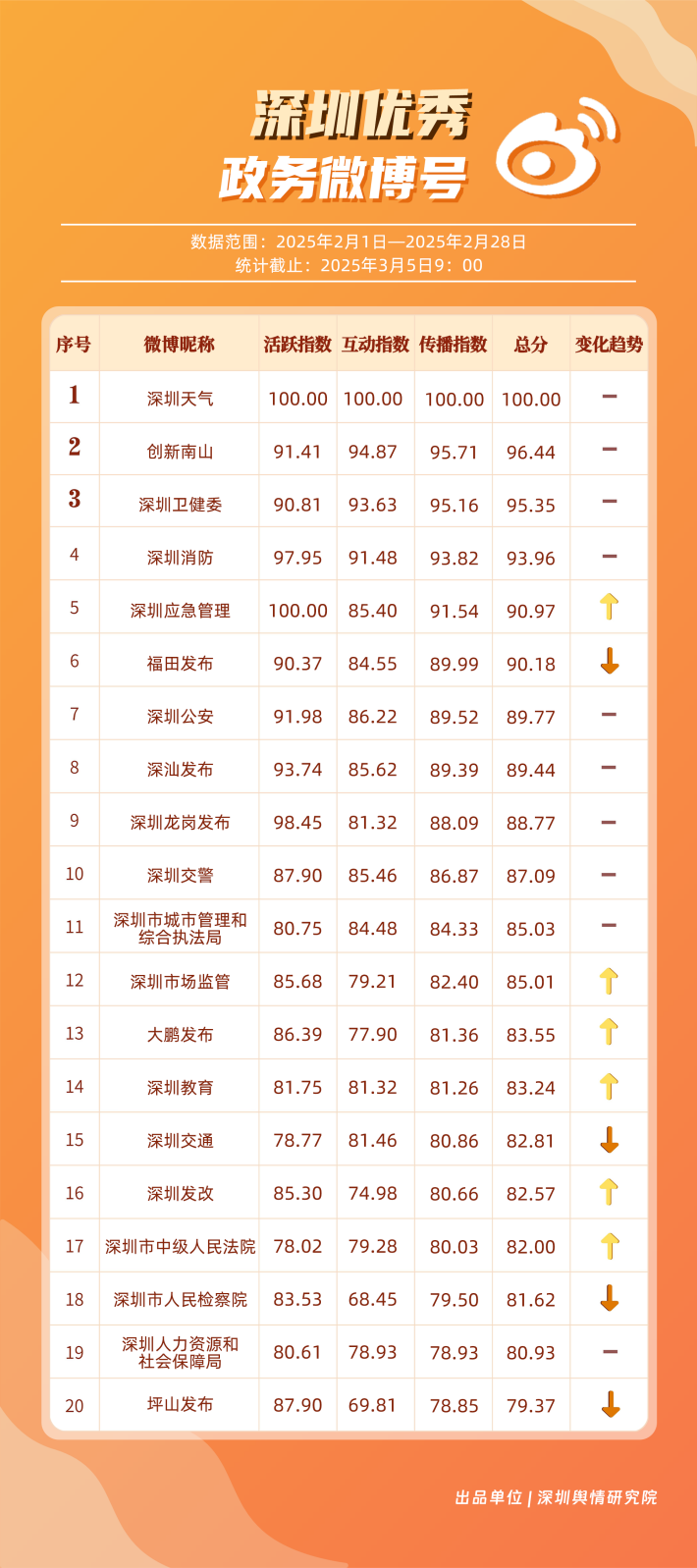 2025年2月期《深圳优秀政务新媒体矩阵》发布,本期榜单框架有所优化,公众号、微博号、抖音号、视频号得分在综合计算时的权重调整为30%、20%、30%、20%。公众号榜单中,根据阅读量超10万次的文章篇数,在传播指数额外加分,激励优质内容产出。接下来,让我们一同揭晓,2月哪些矩阵成为政务信息传播与服务创新标杆,为政务新媒体矩阵创新发展树立高质量发展范式。