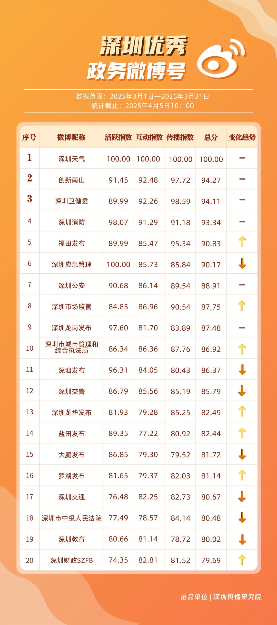 3月,市卫生健康委、龙岗区、市气象局、深汕特别合作区、南山区、福田区、市应急管理局、龙华区、宝安区、光明区荣登“深圳优秀政务新媒体矩阵”榜单。3月,市卫生健康委新媒体矩阵持续关注市民身心健康,发布健康科普内容,稳居榜单第一位;龙岗区新媒体矩阵在抖音、微信视频号平台发力宣传,跃居榜单第二位;市气象局新媒体矩阵在微博平台连续多期获得满分,持续以气象预警与生活指南结合的内容模式,为市民带来便利信息。以上账号在“深圳优秀政务新媒体矩阵”榜单中荣获前三名。此外,深汕特别合作区新媒体矩阵积极发布网络热点内容,收获较多网民关注分享;南山区新媒体矩阵多平台实力强劲,以88.37分居于榜单第五位。值得关注的是,宝安区新媒体矩阵时隔多期跻身榜单前十名,多平台均衡发展成效初显。