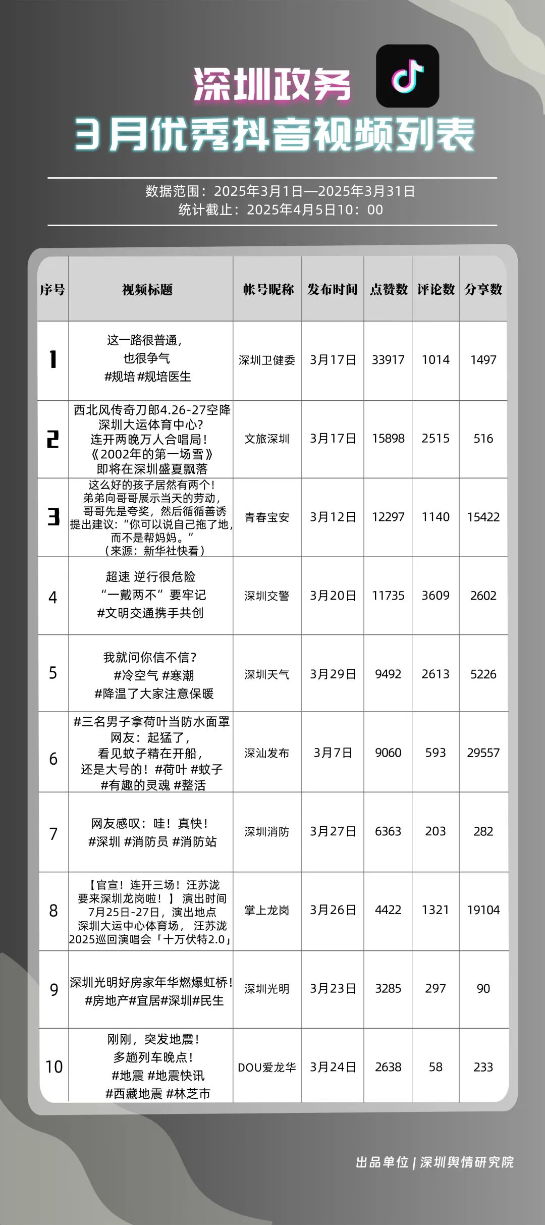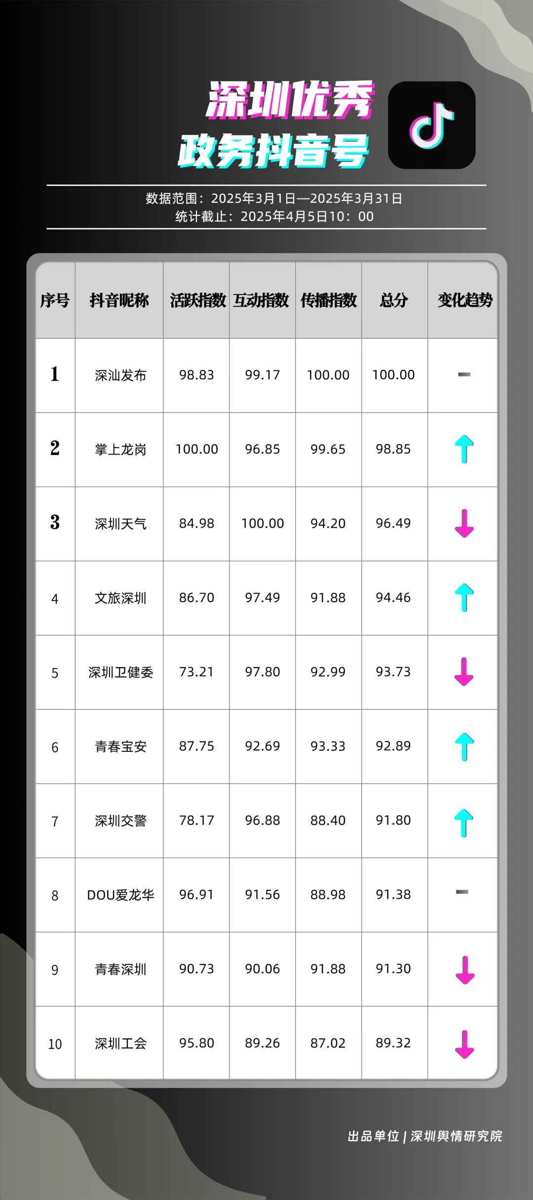 3月,“深汕发布”“掌上龙岗”“深圳天气”“文旅深圳”“深圳卫健委”“青春宝安”“深圳交警”“DOU爱龙华”“青春深圳”“深圳工会”共10个政务抖音号获得“深圳优秀政务抖音号”称号。其中,“深汕发布”位于榜单第一名,3月共收获5万余次点赞、8万余次转发,反映出账号作品的较高吸引力;“深圳龙岗”以98.85分位于榜单第二名,与榜首分差微小,整体实力不俗。紧随其后的分别是“深圳天气”“文旅深圳”“深圳卫健委”,三账号产出内容优质,也获得较高评分。相关上榜单位展现了深圳政务新媒体账号在短视频传播领域的创新探索力与传播实效性。