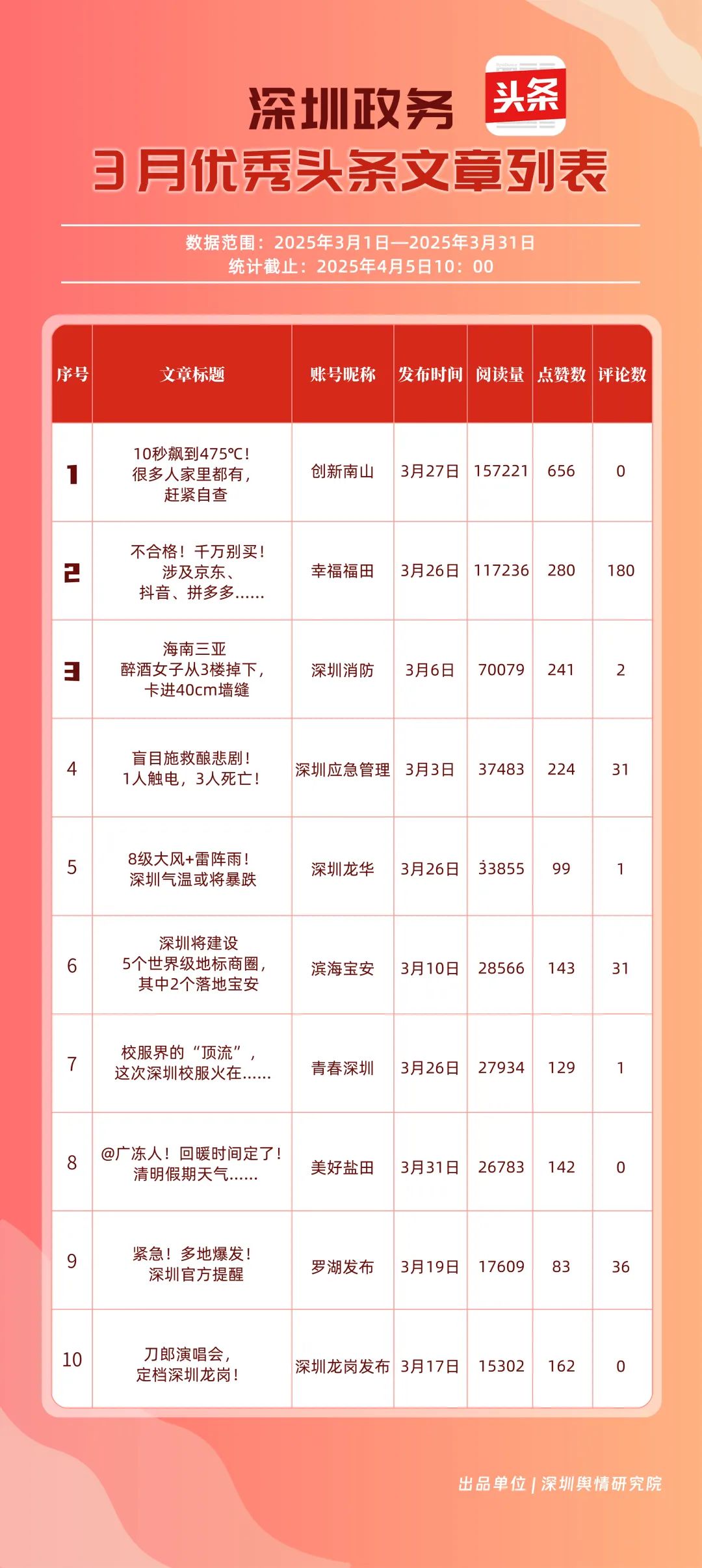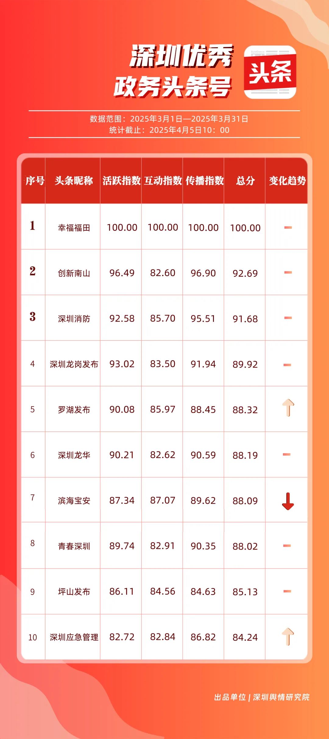 3月,“幸福福田”“创新南山”“深圳消防”“深圳龙岗发布”“罗湖发布”“深圳龙华”“滨海宝安”“青春深圳”“坪山发布”“深圳应急管理”共10个政务头条号入选“优秀政务头条号”榜单。上榜账号中,“幸福福田”“创新南山”“深圳消防”“深圳龙岗发布”在头条平台排名较为稳固,排名未产生变动。当月,“深圳应急管理”以84.24分跻身榜单前十。