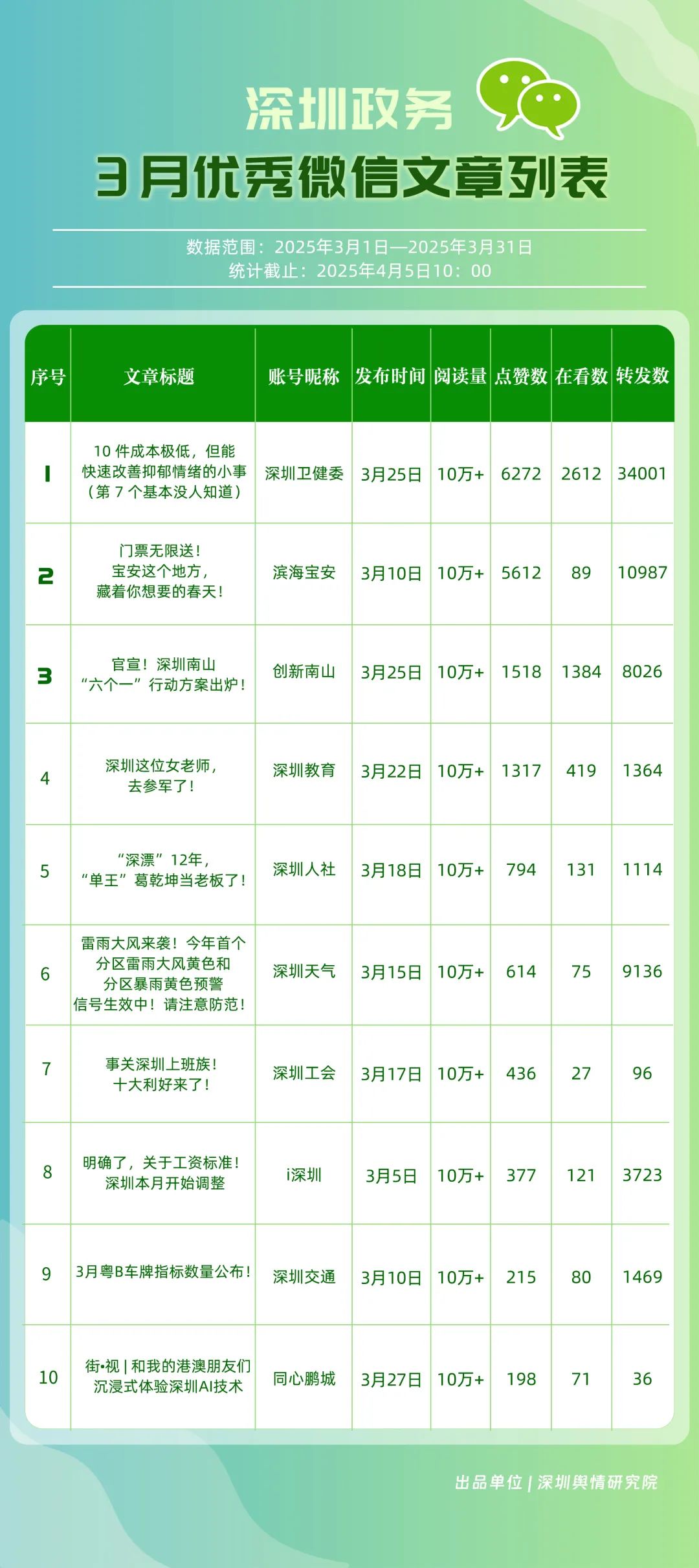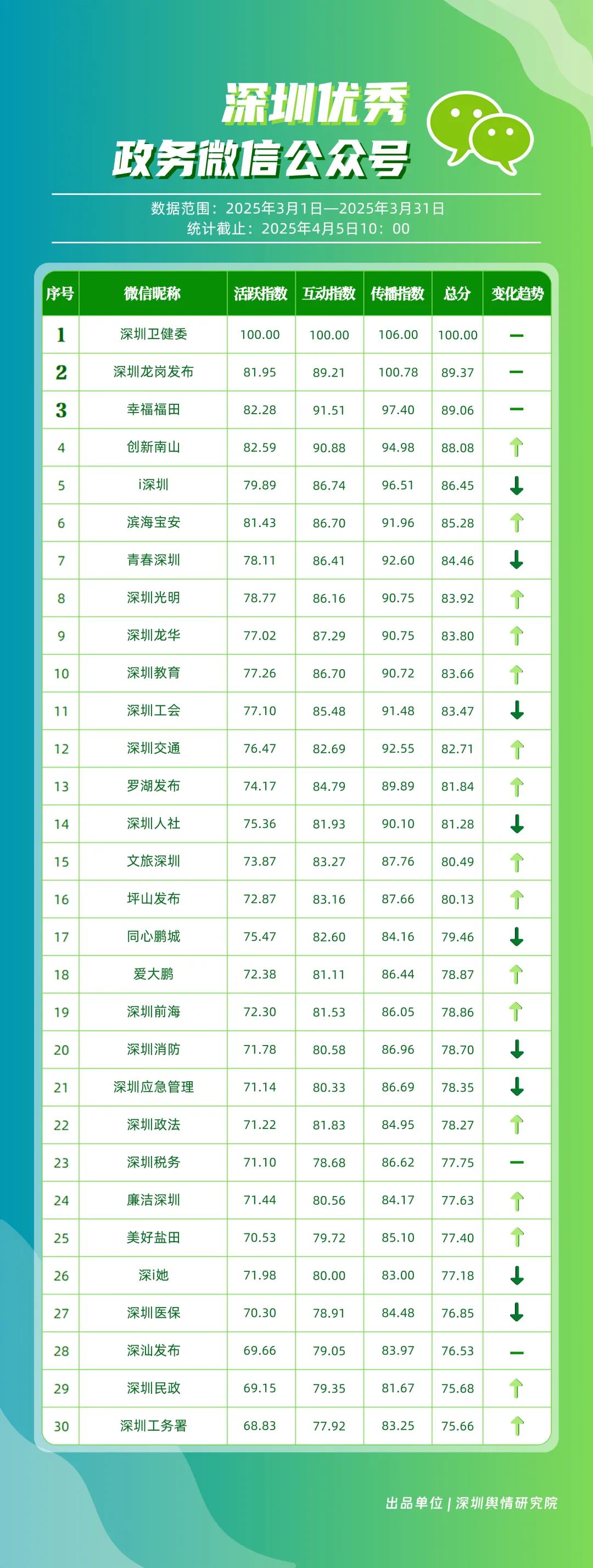 3月,包括“深圳卫健委”“深圳龙岗发布”“幸福福田”“创新南山”“i深圳”“滨海宝安”“青春深圳”“深圳光明”“深圳龙华”“深圳教育”等在内的30个账号入选“深圳优秀政务微信公众号”。其中,“深圳卫健委”超70篇文章阅读量达10万次以上,稳居榜单首位;“深圳龙岗发布”也取得较好传播效果,在3月产出10余篇阅读量超10万次的热门文章,位于榜单第二位;“幸福福田”也积极发布高质量内容,稳住榜单第三位置;紧随其后的是“创新南山”“i深圳”“滨海宝安”,总分均在85分以上。这充分展现了深圳新媒体传播生态体系中,各主体的传播优势与影响力版图正逐渐凸显。