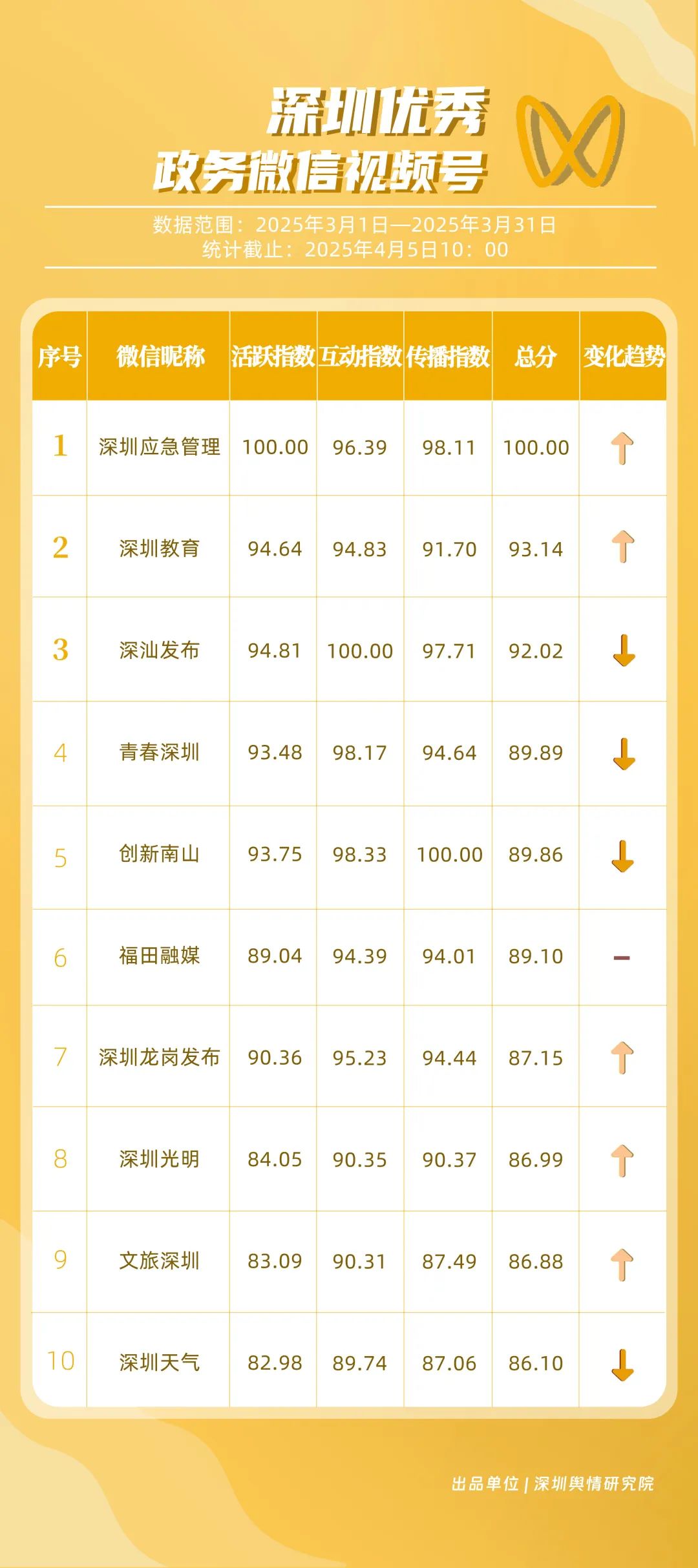 《深圳优秀政务新媒体矩阵》将深圳党政机关、企事业单位开设的政务公众号(微信)、微博号、抖音号、视频号(微信)及头条号按照活跃指数、互动指数、传播指数三项指标进行综合评价,最终形成优秀名单。