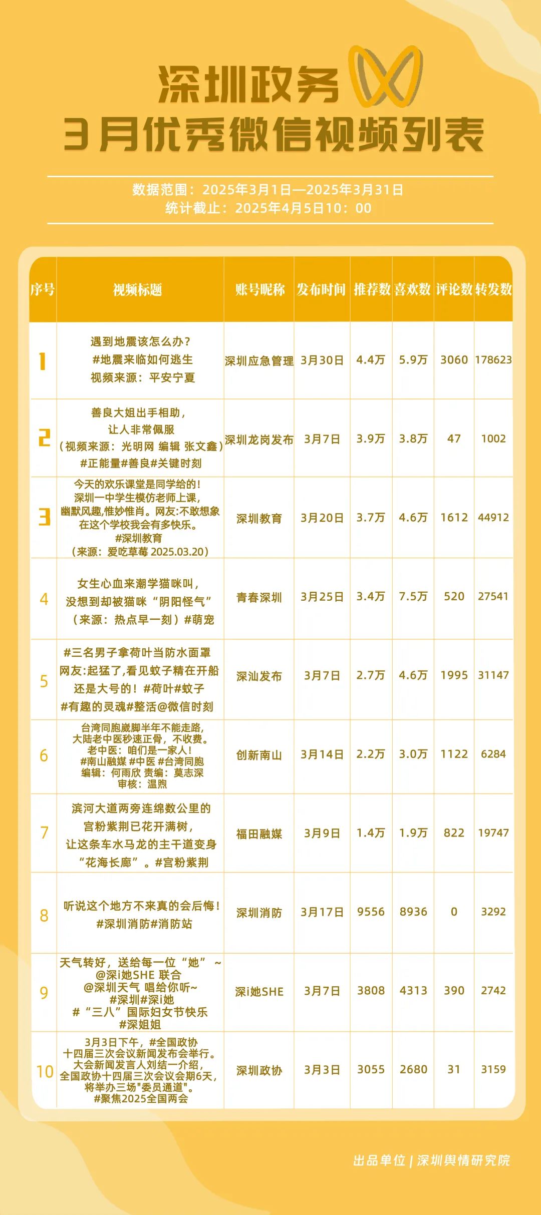3月,获“深圳优秀政务微信视频号”称号的分别是“深圳应急管理”“深圳教育”“深汕发布”“青春深圳”“创新南山”“福田融媒”“深圳龙岗发布”“深圳光明”“文旅深圳”“深圳天气”。其中,“深圳应急管理”以20余篇作品收获超20万次转发,跃居第一名,一期有关“地震来临如何逃生”的视频收获超17万次转发,展现了其内容的高实用性。“深圳教育”“深汕发布”位于榜单第二、三位,总分超90分,反映出两账号在民生教育、区域宣传领域拥有较好传播效果。“青春深圳”“创新南山”“福田融媒”等账号也在3月发布优质视频内容,展现了深圳政务新媒体在视频号平台宣传的创新探索。