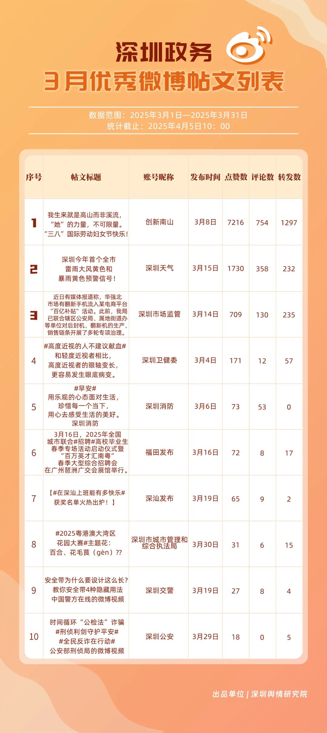 3月,“深圳天气”“创新南山”“深圳卫健委”“深圳消防”“福田发布”“深圳应急管理”“深圳公安”“深圳市场监管”“深圳龙岗发布”“深圳市城市管理和综合执法局”等20个账号入选“优秀政务微博号”。值得一提的是,“深圳天气”账号在3月共获得点赞超11万,相较其他账号具备显著优势。“创新南山”“深圳卫健委”“深圳消防”也位列前茅,分差微小,竞争激烈。从领域分布来看,上榜账号不仅包括区级账号,还涵盖民生服务、应急科普、城市治理等单位账号,体现了深圳政务新媒体在多领域的强大影响力。