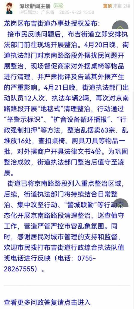 接市民反映问题后,布吉街道立即安排执法部门前往现场开展整治。4月20日晚,街道执法部门对京南路路段外摆扰民问题开展整治,现场督促商家对外摆桌椅等物品进行清理,并严肃批评及告诫其外摆产生的严重影响。4月21日晚,街道执法部门出动队员12人次、执法车辆2辆,再次对京南路路段开展“地毯式”清理整治,行动通过“举警示标识“、“扩音设备循环播报“、“行政强制扣押“等方法,整治乱摆卖63宗、乱堆放16处,查扣桌椅、厨具刀具等物品一批,对外摆商户开具法律文书4份。为巩固整治成效,街道执法部门整治后值守至凌晨。街道已将京南路路段列入重点整治区域,后续,街道执法部门将持续结合日常整治、集中攻坚行动、“警城联勤”等行动常态化开展京南路路段清理整治、巡查值守工作,营造严管严控市容乱象氛围。同时,感谢居民对城市管理的支持和监督,欢迎市民拨打布吉街道行政综合执法队值班电话进行反映(电话:0755-28267555)。