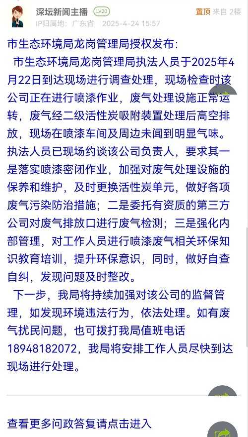 市生态环境局龙岗管理局执法人员于2025年4月22日到达现场进行调查处理,现场检查时该公司正在进行喷漆作业,废气处理设施正常运转,废气经二级活性炭吸附装置处理后高空排放,现场在喷漆车间及周边未闻到明显气味。执法人员已现场约谈该公司负责人,要求其一是落实喷漆密闭作业,加强对废气处理设施的保养和维护,及时更换活性炭单元,做好各项废气污染防治措施;二是委托有资质的第三方公司对废气排放口进行废气检测;三是强化内部管理,对工作人员进行喷漆废气相关环保知识教育培训,提升环保意识,同时,做好自查自纠,发现问题及时整改。下一步,我局将持续加强对该公司的监督管理,如发现环境违法行为,依法处理。如有废气扰民问题,也可拨打我局值班电话18948182072,我局将安排工作人员尽快到达现场进行处理。