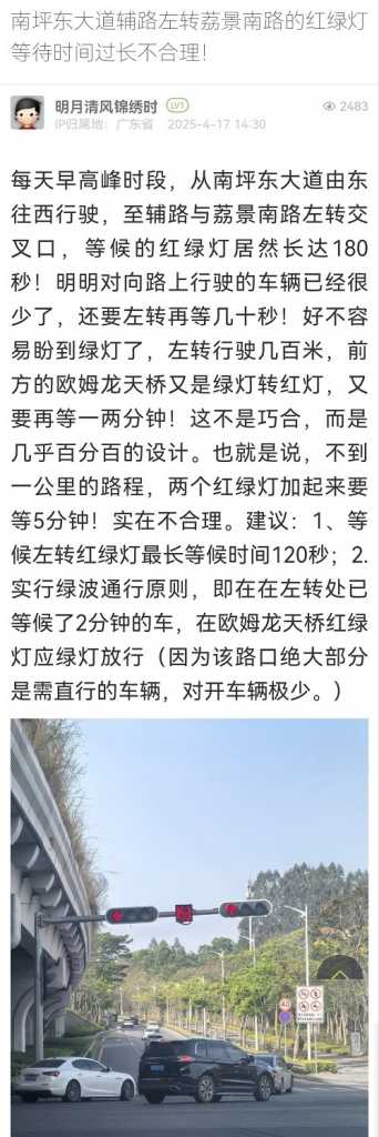 21. 帖文《南坪东大道辅路左转荔景南路的红绿灯等待时间过长不合理!》