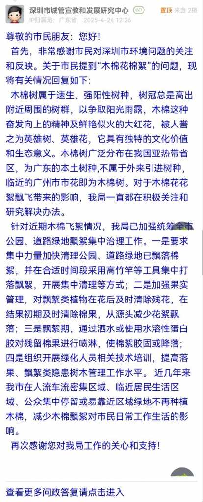 首先,非常感谢市民对深圳市环境问题的关注和反映。关于市民提到“木棉花棉絮”的问题,现将有关情况回复如下:
