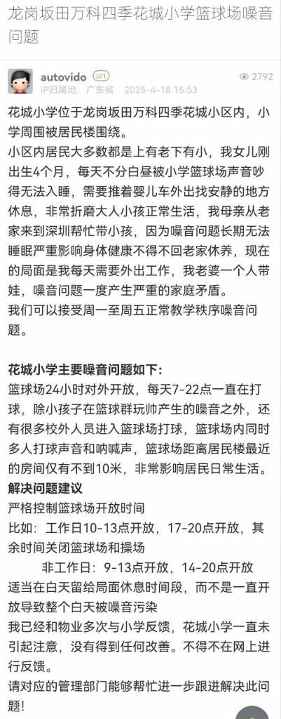 18. 帖文《龙岗坂田万科四季花城小学篮球场噪音问题》