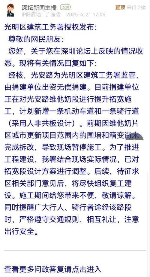 尊敬的网民朋友:您好,关于您在深圳论坛上反映的情况收悉。现将有关情况回复如下:经核,光安路为光明区建筑工务署监管、由捐建单位出资无偿捐建。目前捐建单位正在对光安路维他奶段进行提升拓宽施工,计划新增一条机动车道和一条骑行道(采用人非共板设计)。前期因维他奶片区城市更新项目范围内的围墙和箱变尚未完成拆改,导致现场暂停施工。为了推进工程建设,我署结合现场实际情况,已对拓宽段设计方案进行调整。后续,待征求区相关部门意见后,将尽快组织复工建设。施工期间给您带来不便,敬请谅解。同时提醒广大行人、骑行者途经该路段时,严格遵守交通规则,相互礼让,注意出行安全。
