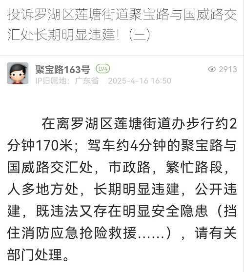 30. 帖文《投诉罗湖区莲塘街道聚宝路与国威路交汇处长期明显违建!(四)》