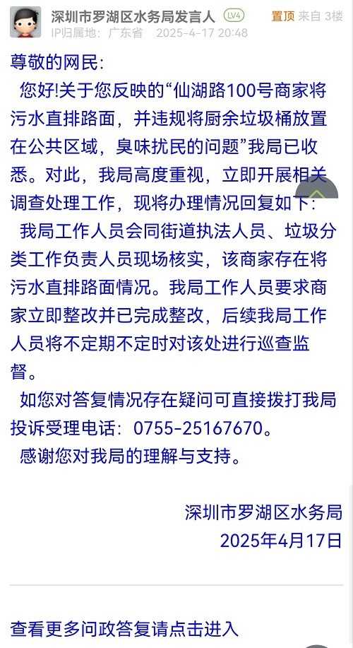 尊敬的网民:您好!关于您反映的“仙湖路100号商家将污水直排路面,并违规将厨余垃圾桶放置在公共区域,臭味扰民的问题”我局已收悉。对此,我局高度重视,立即开展相关调查处理工作,现将办理情况回复如下:我局工作人员会同街道执法人员、垃圾分类工作负责人员现场核实,该商家存在将污水直排路面情况。我局工作人员要求商家立即整改并已完成整改,后续我局工作人员将不定期不定时对该处进行巡查监督。如您对答复情况存在疑问可直接拨打我局投诉受理电话:0755-25167670。感谢您对我局的理解与支持。