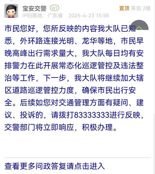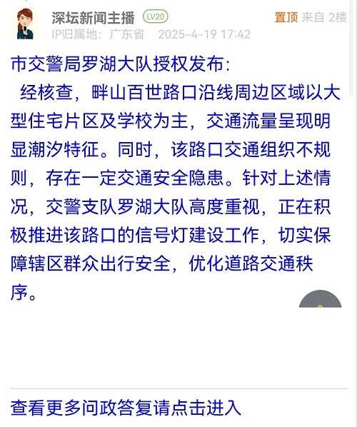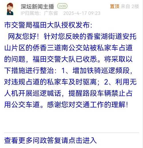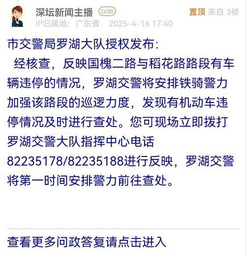 据统计,2025年4月14日-2025年4月20日,网友在深圳论坛发布问政类帖文共35篇,得到相关单位正式回应的帖文数为31篇,本期简报回应速度最快的单位:市交警局罗湖大队、罗湖区莲塘街道办事处。