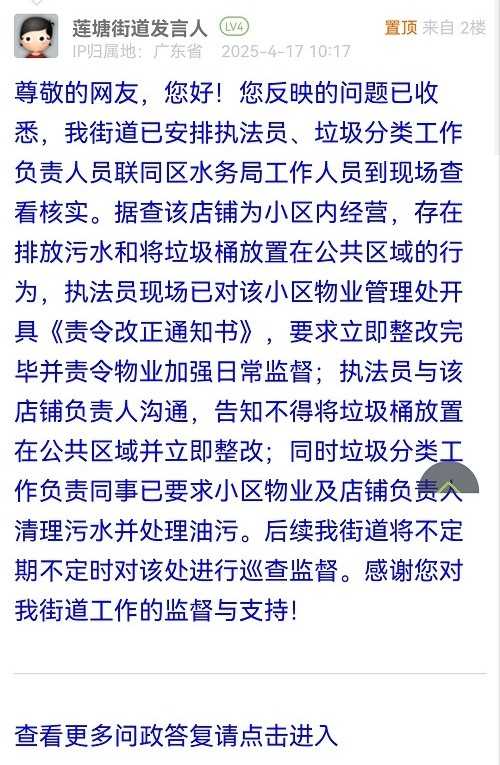 尊敬的网友,您好!您反映的问题已收悉,我街道已安排执法员、垃圾分类工作负责人员联同区水务局工作人员到现场查看核实。据查该店铺为小区内经营,存在排放污水和将垃圾桶放置在公共区域的行为,执法员现场已对该小区物业管理处开具《责令改正通知书》,要求立即整改完毕并责令物业加强日常监督;执法员与该店铺负责人沟通,告知不得将垃圾桶放置在公共区域并立即整改;同时垃圾分类工作负责同事已要求小区物业及店铺负责人清理污水并处理油污。后续我街道将不定期不定时对该处进行巡查监督。感谢您对我街道工作的监督与支持!