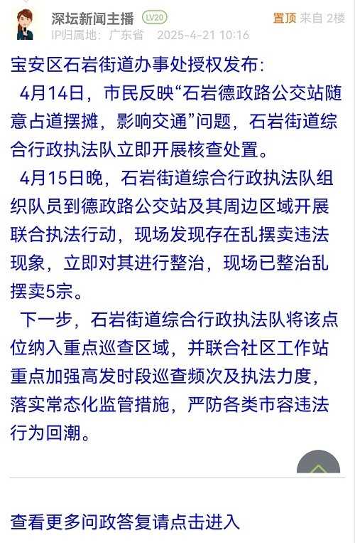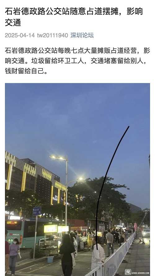 1. 帖文《石岩德政路公交站随意占道摆摊,影响交通》