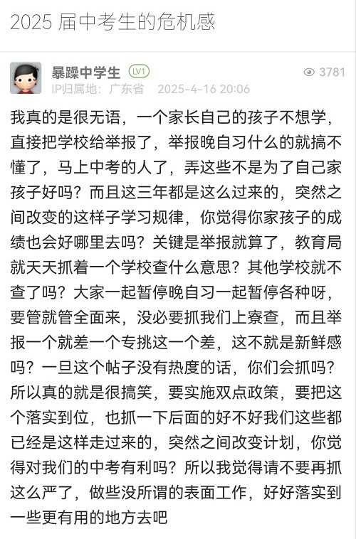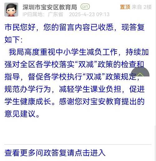 市民您好,您的留言内容已收悉,现答复如下:我局高度重视中小学生减负工作,持续加强对全区各学校落实“双减”政策的检查和指导,督促各学校执行“双减”政策规定,规范办学行为,减轻学生课业负担,促进学生健康成长。感谢您对宝安教育提出的意见建议。