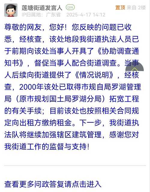 尊敬的网友,您好!您反映的问题已收悉,经核查,该处地段我街道执法人员已于前期向该处当事人开具了《协助调查通知书》,督促当事人配合街道调查。当事人后续向街道提供了《情况说明》,经核查,2000年该处已取得市规自局罗湖管理局(原市规划国土局罗湖分局)拓宽工程的有关手续;目前该处也按照相关合同规定向出租方缴纳租金。下一步,我街道执法队将继续加强辖区建筑管理,感谢您对我街道工作的监督与支持!