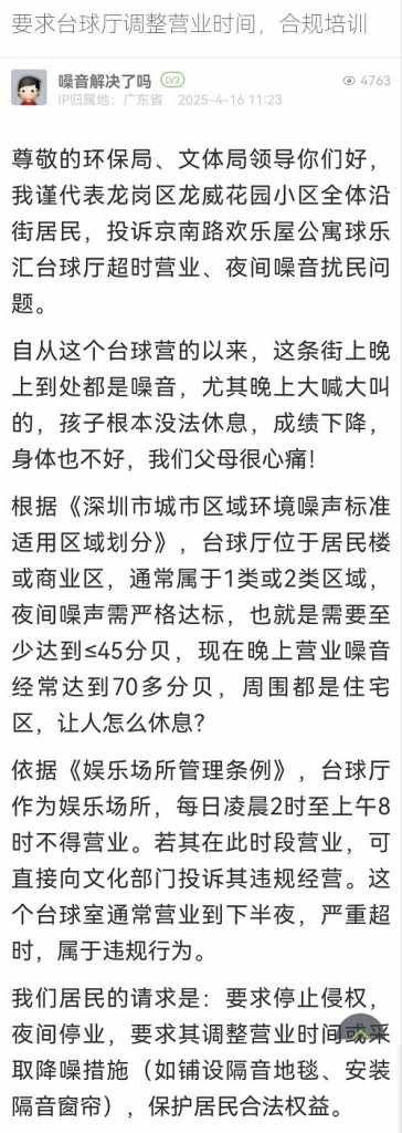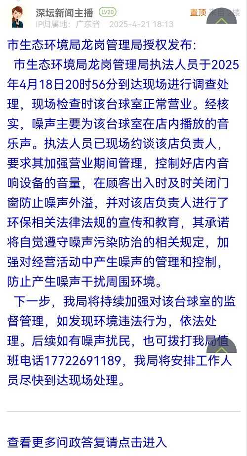 市生态环境局龙岗管理局执法人员于2025年4月18日20时56分到达现场进行调查处理,现场检查时该台球室正常营业。经核实,噪声主要为该台球室在店内播放的音乐声。执法人员已现场约谈该店负责人,要求其加强营业期间管理,控制好店内音响设备的音量,在顾客出入时及时关闭门窗防止噪声外溢,并对该店负责人进行了环保相关法律法规的宣传和教育,其承诺将自觉遵守噪声污染防治的相关规定,加强对经营活动中产生噪声的管理和控制,防止产生噪声干扰周围环境。下一步,我局将持续加强对该台球室的监督管理,如发现环境违法行为,依法处理。后续如有噪声扰民,也可拨打我局值班电话17722691189,我局将安排工作人员尽快到达现场处理。