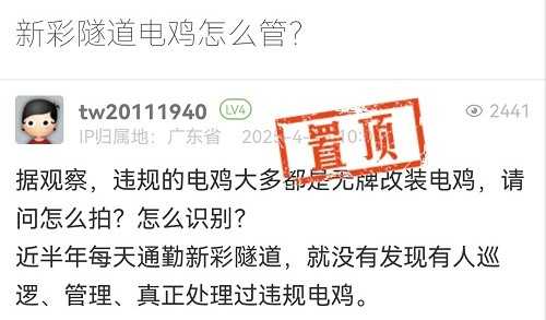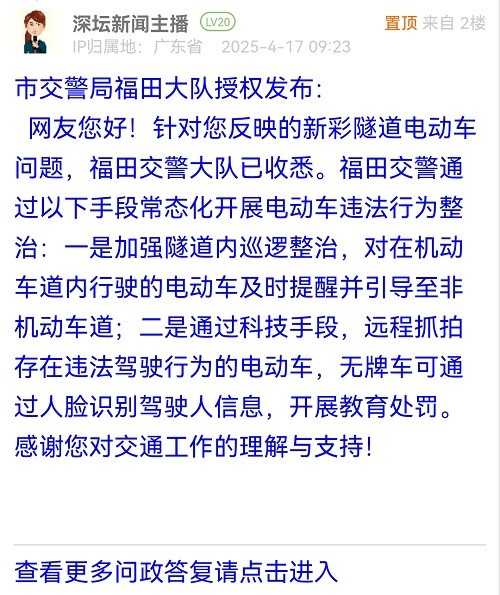 网友您好!针对您反映的新彩隧道电动车问题,福田交警大队已收悉。福田交警通过以下手段常态化开展电动车违法行为整治:一是加强隧道内巡逻整治,对在机动车道内行驶的电动车及时提醒并引导至非机动车道;二是通过科技手段,远程抓拍存在违法驾驶行为的电动车,无牌车可通过人脸识别驾驶人信息,开展教育处罚。感谢您对交通工作的理解与支持!