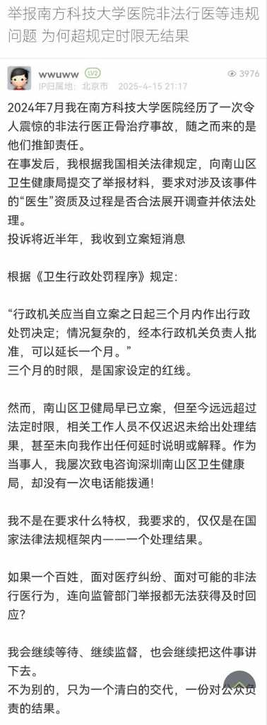 6. 帖文《举报南方科技大学医院非法行医等违规问题 为何超规定时限无结果》