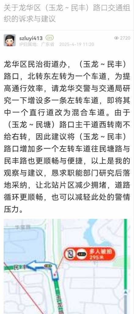 20. 帖文《关于龙华区(玉龙~民丰)路口交通组织的诉求与建议》