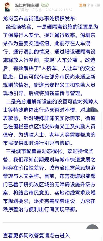 经现场核实,一是硬隔离设施的设置是为了保障行人安全、提升通行效率。深圳东站作为重要交通枢纽,此前存在人车混行、通行混乱的情况。通过增设硬隔离设施释放人行空间,实现“人车分离”。改造后,有效解决了“人挤车、人让车”的安全隐患。目前可能存在部分市民尚未适应新规则的情况,街道已安排义工和执勤人员现场引导,后续将加强宣传与管理。二是充分理解新设施的设置可能对残障人士等特殊群体出行造成暂时不便,对此深表歉意。针对特殊群体的实际需求,街道已在围栏重点区域安排有义工及执勤人员值守,为残障人士、老年人等需要帮助的市民提供即时通行引导与协助。三是城市配套需动态优化,欢迎持续监督。我们深知前期规划与城市快速发展之间存在阶段性差异,城市治理需兼顾规范管理与人文关怀。目前,布吉街道职能部门已着手研究该区域的无障碍设施升级方案,将结合市民意见、实地动线需求及城市规划要求,逐步完善配套建设,力求在秩序整治与便利出行间实现平衡。