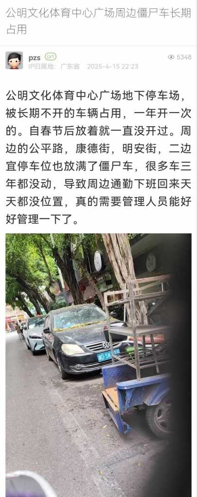 7. 帖文《公明文化体育中心广场周边僵尸车长期占用》