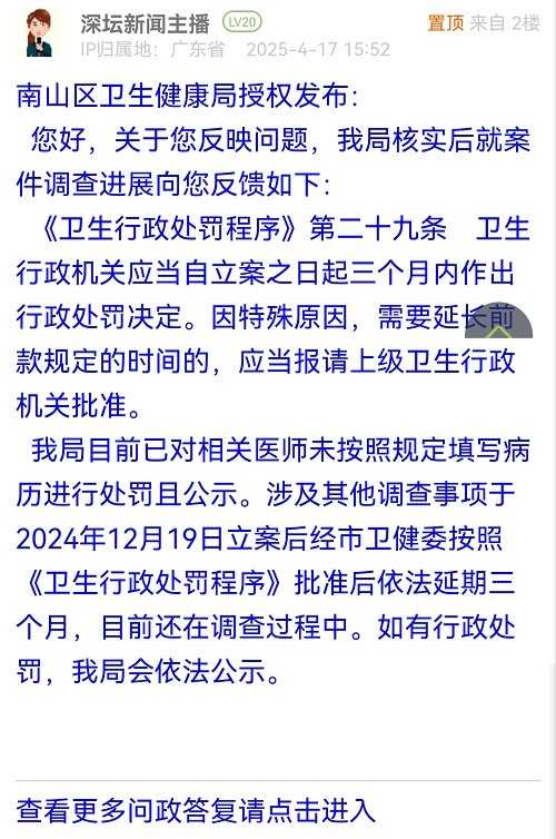 您好,关于您反映问题,我局核实后就案件调查进展向您反馈如下:《卫生行政处罚程序》第二十九条 卫生行政机关应当自立案之日起三个月内作出行政处罚决定。因特殊原因,需要延长前款规定的时间的,应当报请上级卫生行政机关批准。我局目前已对相关医师未按照规定填写病历进行处罚且公示。涉及其他调查事项于2024年12月19日立案后经市卫健委按照《卫生行政处罚程序》批准后依法延期三个月,目前还在调查过程中。如有行政处罚,我局会依法公示。