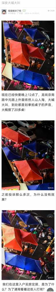 17. 帖文《深夜大喊大叫》《宵夜店投诉了两个月,没有效果》《外摆扰民一直没有解决,建筑红线到底是哪里?》