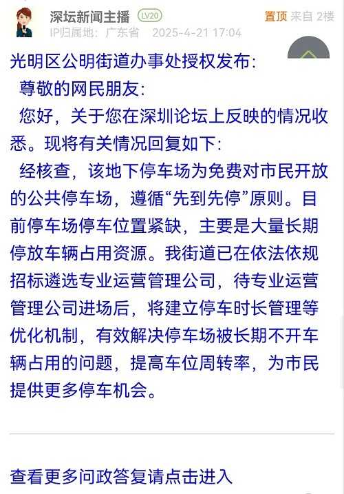 尊敬的网民朋友:您好,关于您在深圳论坛上反映的情况收悉。现将有关情况回复如下:经核查,该地下停车场为免费对市民开放的公共停车场,遵循“先到先停”原则。目前停车场停车位置紧缺,主要是大量长期停放车辆占用资源。我街道已在依法依规招标遴选专业运营管理公司,待专业运营管理公司进场后,将建立停车时长管理等优化机制,有效解决停车场被长期不开车辆占用的问题,提高车位周转率,为市民提供更多停车机会。