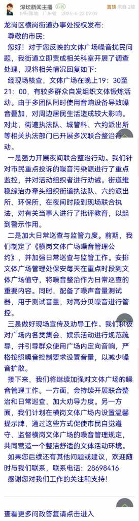 接下来,我们将继续加强对文体广场的噪音管理工作。一方面,会持续开展联合整治和日常巡查,加大劝导力度。另一方面,我们计划在横岗文体广场内设置温馨提示牌,通过这些方式促使市民自觉遵守、监督横岗文体广场的噪音管理规定,共同营造一个整洁舒适的文体活动环境。
