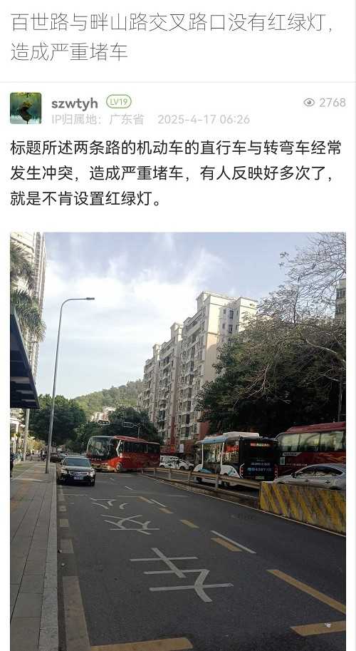 10. 帖文《百世路与畔山路交叉路口没有红绿灯,造成严重堵车》
