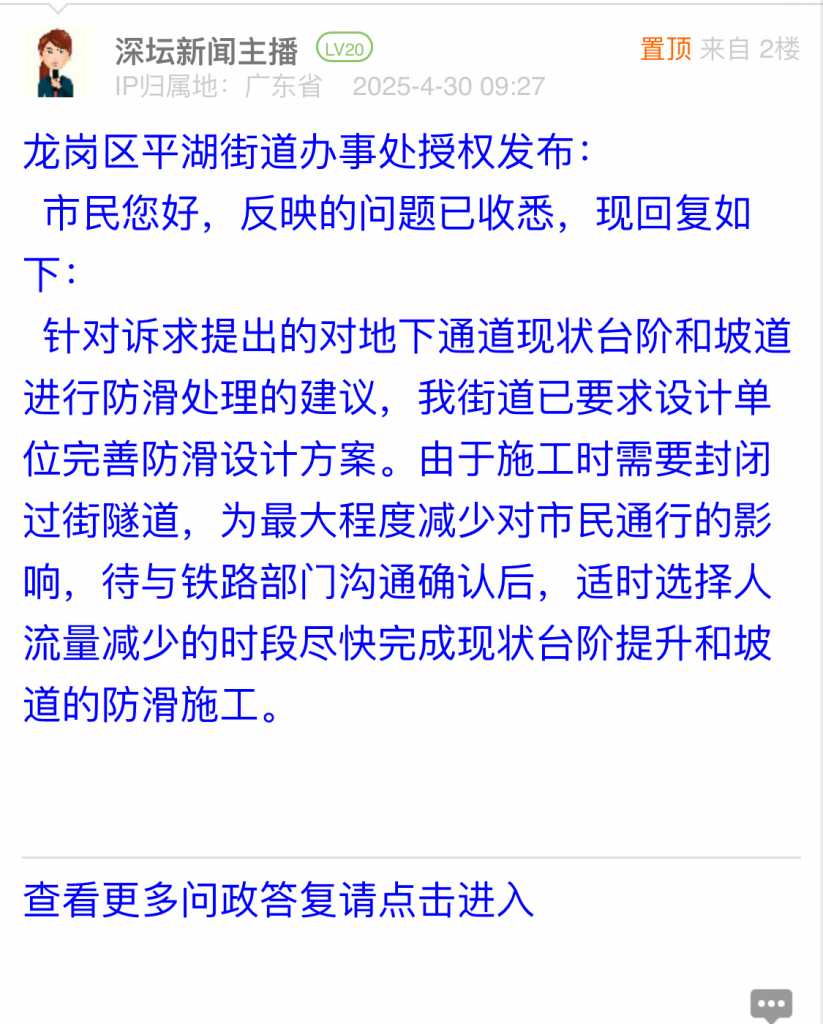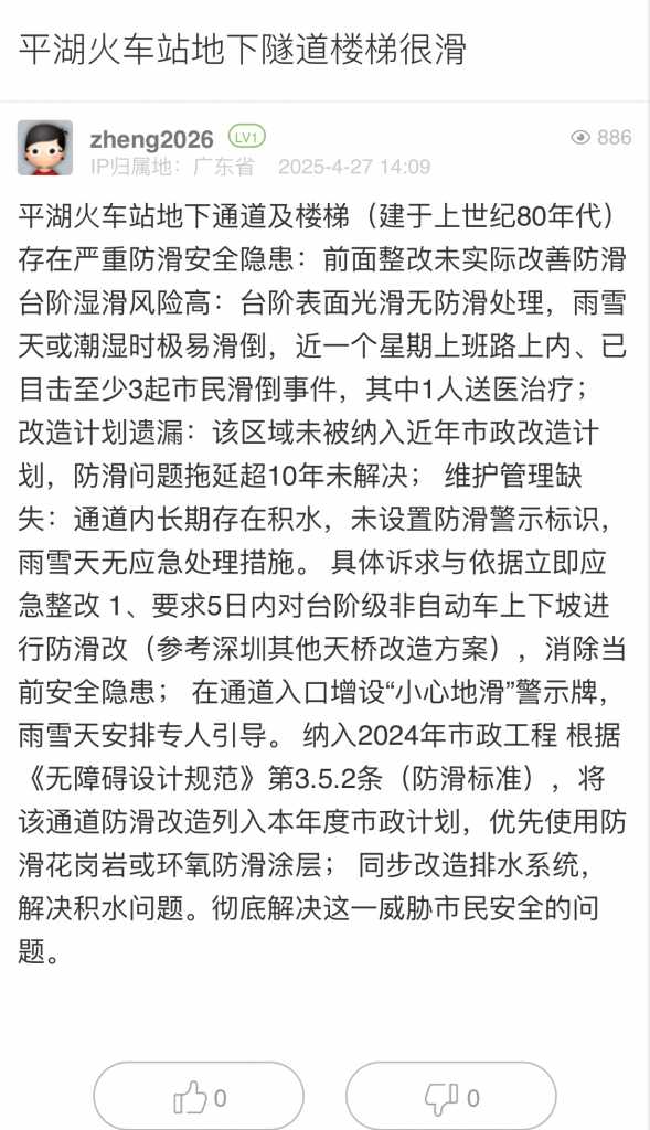 14. 帖文《平湖火车站地下隧道楼梯很滑》