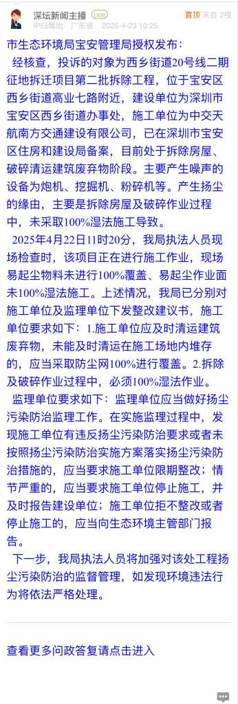 1. 帖文《建筑工地拆除房屋施工未采取降尘措施》