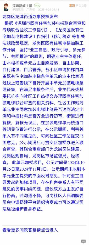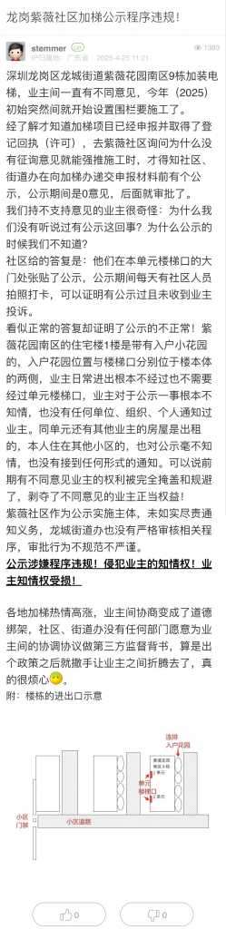 9. 帖文《龙岗紫薇社区加梯公示程序违规!》