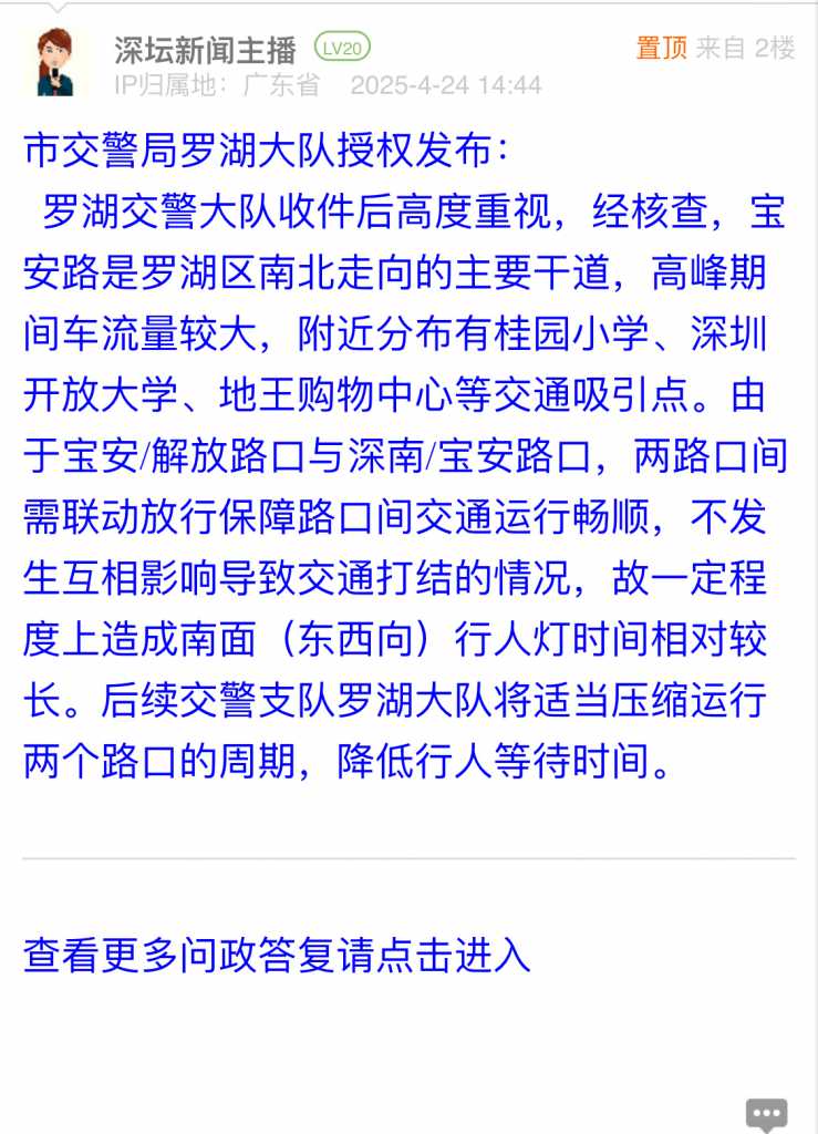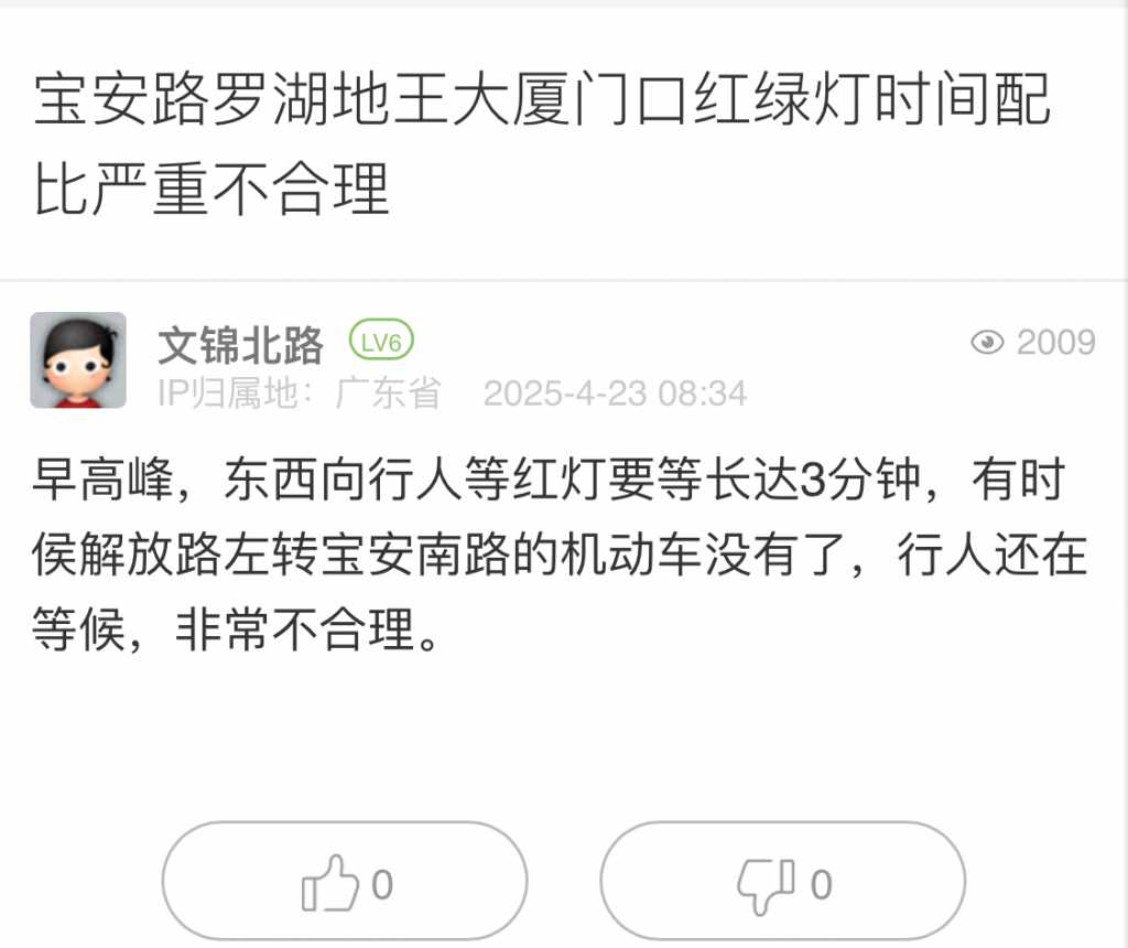 7. 帖文《宝安路罗湖地王大厦门口红绿灯时间配比严重不合理》