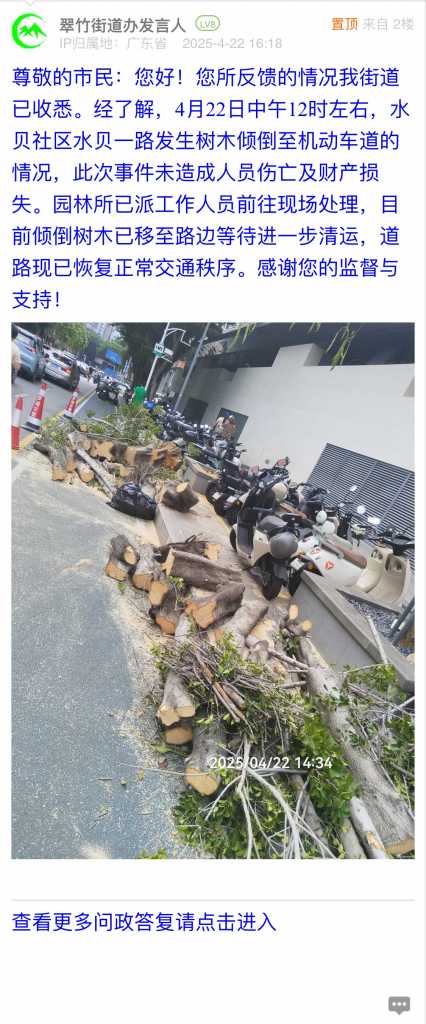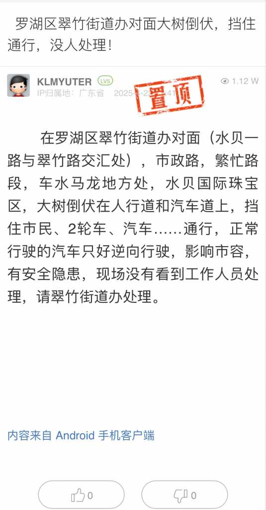 6. 帖文《罗湖区翠竹街道办对面大树倒伏,挡住通行,没人处理!》