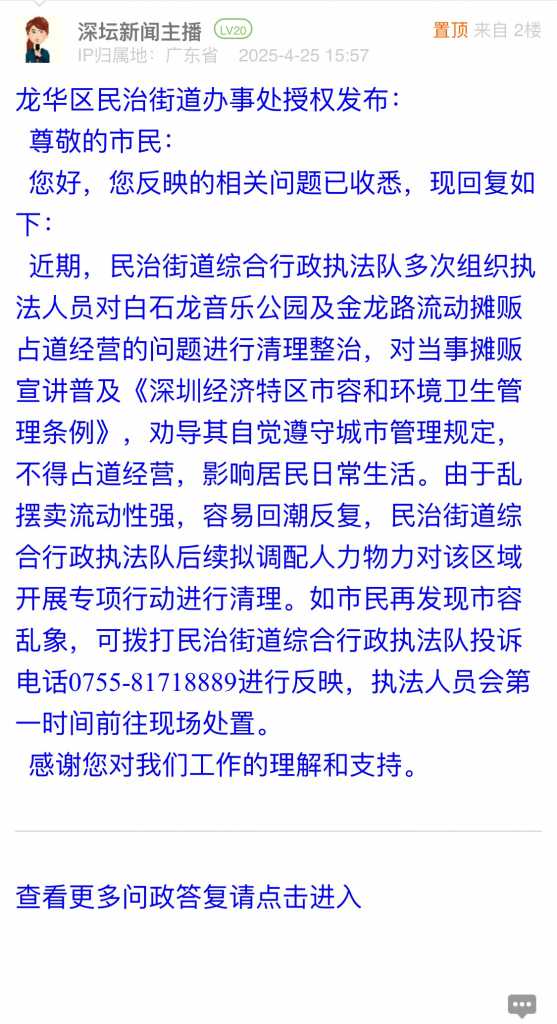 据统计,2025年4月21日-2025年4月27日,网友在深圳论坛发布问政类帖文共28篇,得到相关单位正式回应的帖文数为21篇,本期简报回应速度最快的单位:罗湖区翠竹街道办事处、市市场监督管理局福田监管局、市交警局罗湖大队。