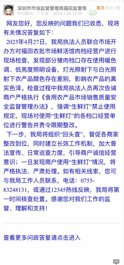 下一步,我局将组织“回头查”,督促各商家整改到位,同时建立长效工作机制,加大普法宣传、日常巡查力度,引导商户诚信经营意识;一旦发现商户使用“生鲜灯”情况,将严格执法、严肃处理。如有相关线索,您可与我局工作人员联系,电话:0755-83248131,或通过12345热线反映,我局将第一时间核查处置。感谢您对我们工作的监督、理解和支持!