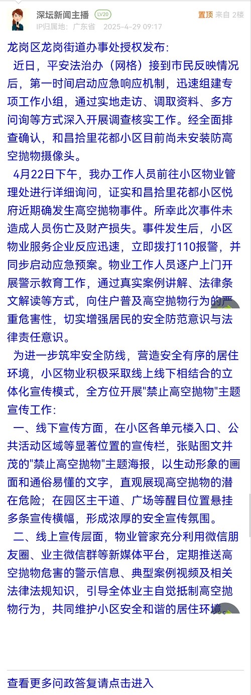 3. 帖文《龙岗一小区多次高空抛物》