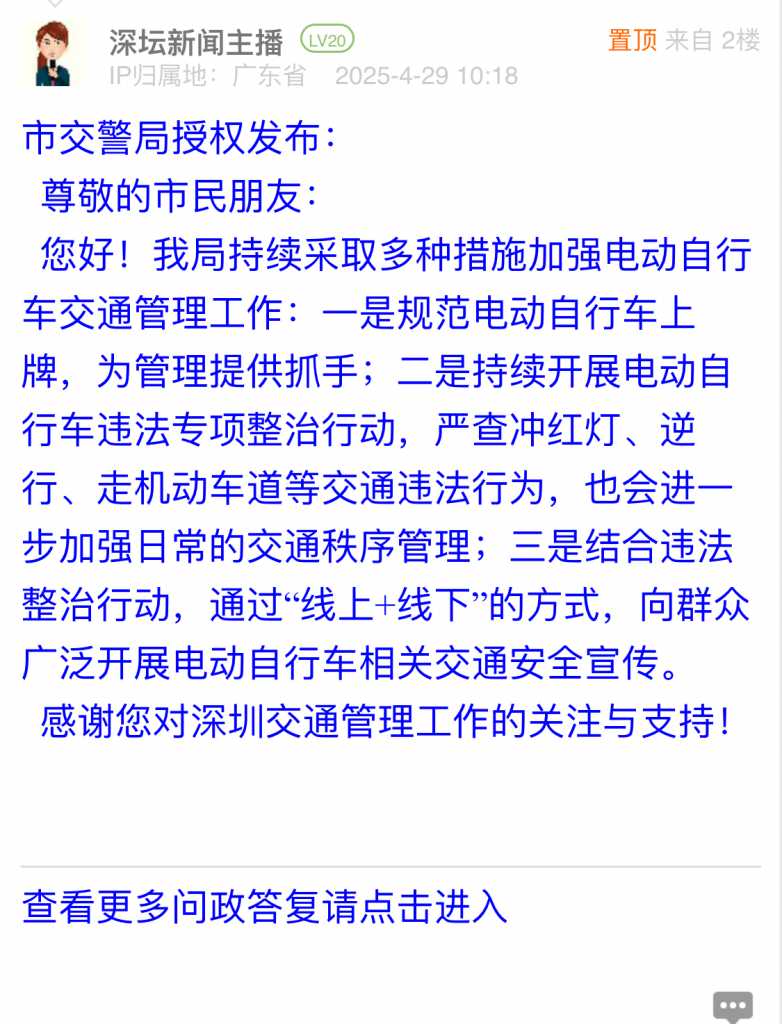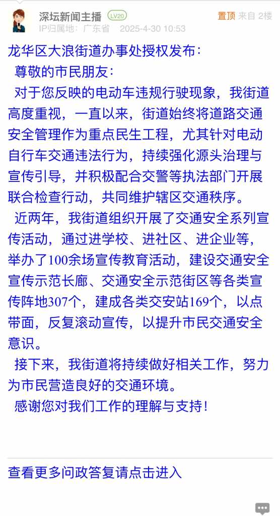 各职能单位如需对网友反映的问题进行回应,可在深圳论坛注册官方账号并通过认证,回帖进行回应。